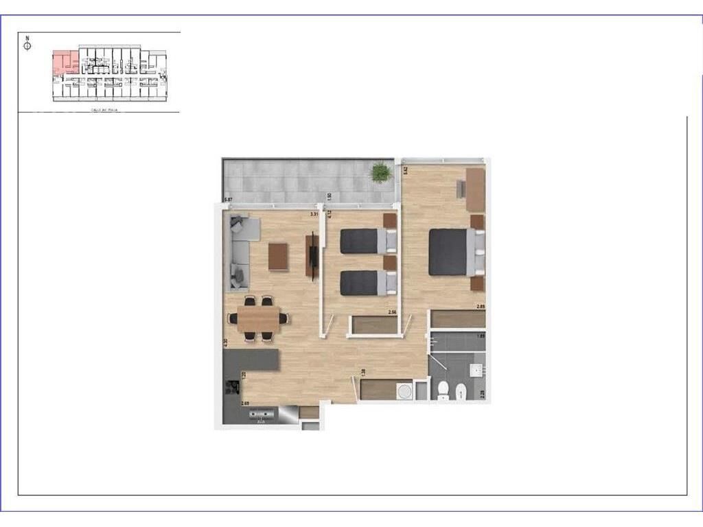 Living comedor con terraza, cocina integrada con placares, 2 dormitorios, 1 baño.