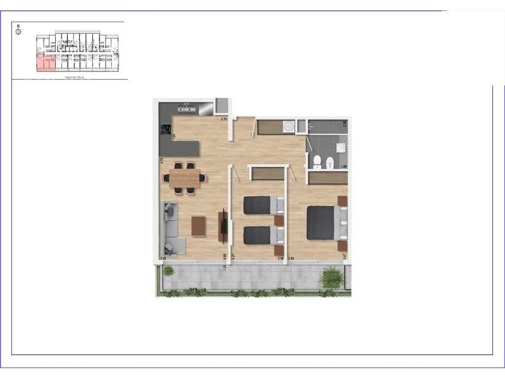 Living comedor con terraza al frente, cocina integrada con placares, 2 dormitorios al frente, 1 baño.