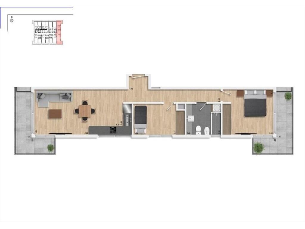 Living comedor con terraza, cocina integrada con placares, 2 dormitorios, 1 baño.
