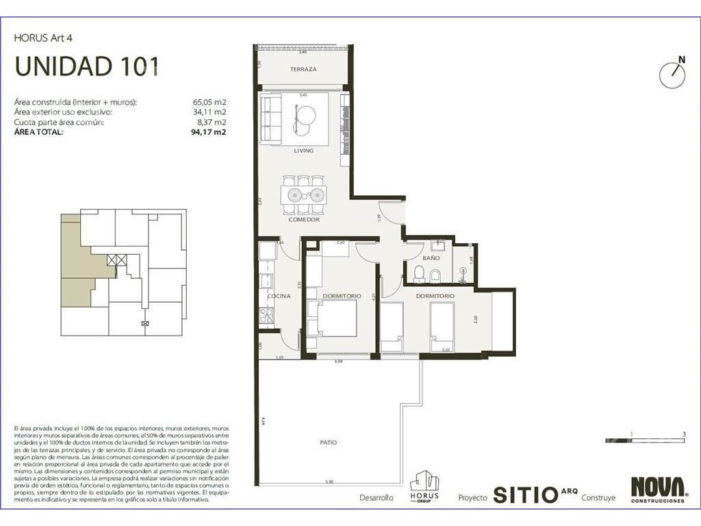 Living comedor con terraza al frente, cocina definida con placares, 2 dormitorios hacia atrás con salida a patio de 30m2, 1 baño completo.