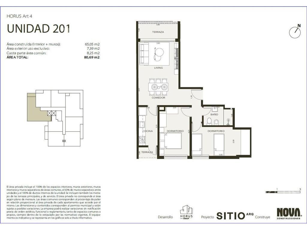 Living comedor con terraza al frente, cocina definida con placares y terraza lavadero, 2 dormitorios hacia atrás, 1 baño completo.