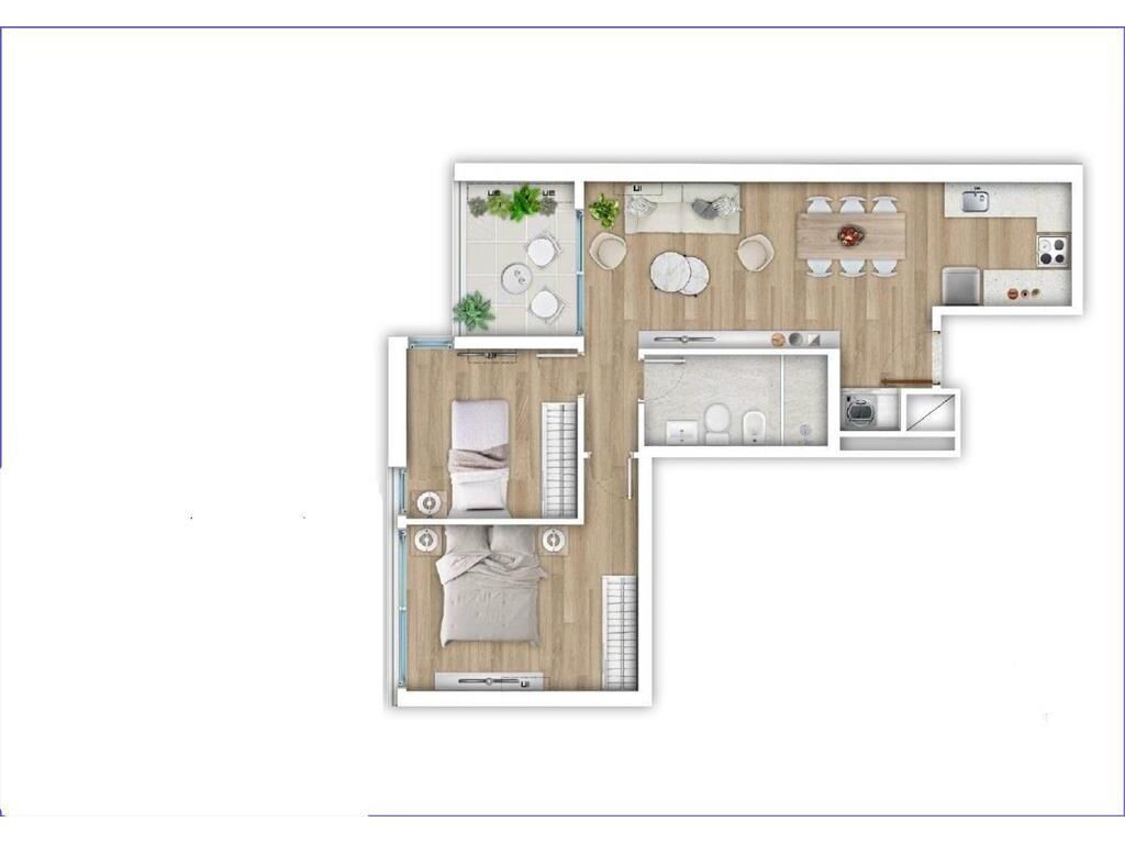 Living comedor con terraza al frente, cocina integrada con placares, 2 dormitorios, 1 baño.