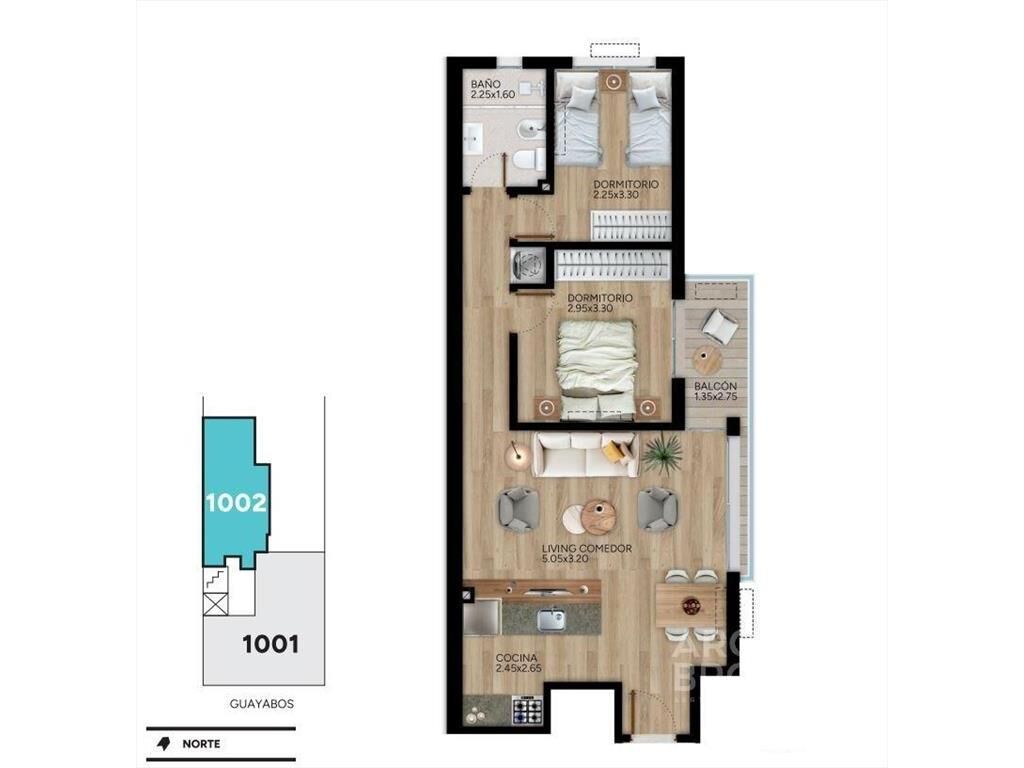 Living comedor con terraza lateral, cocina integrada con placares y campana, 2 dormitorios, 1 baño completo con extractor.
