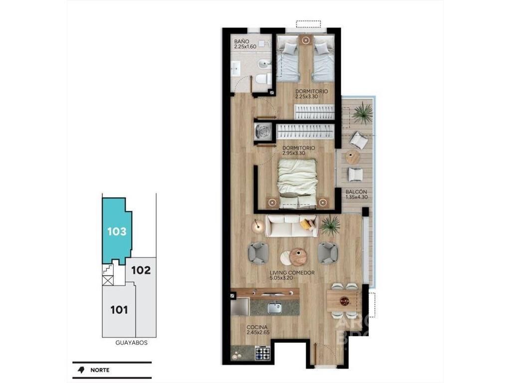 Living comedor con terraza lateral, cocina integrada con placares y campana, 2 dormitorios, 1 baño completo con extractor.