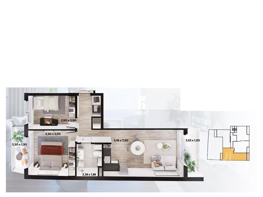 Living comedor con terraza al frente, cocina integrada con placares y mueble para lavarropas y calefón, 2 dormitorios con placares, 1 baño