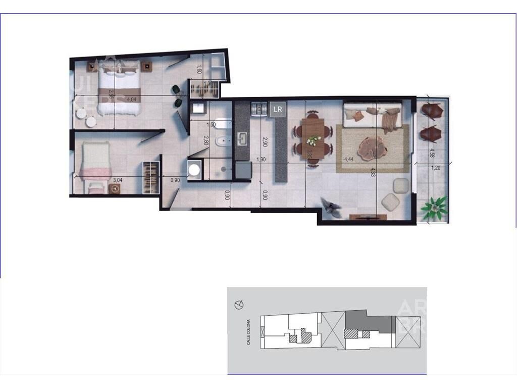Living comedor con salida a terraza, cocina integrada con placares y barra, 2 dormitorios con placares, el principal con vestidor, lugar para lavarropas, 1 baño.