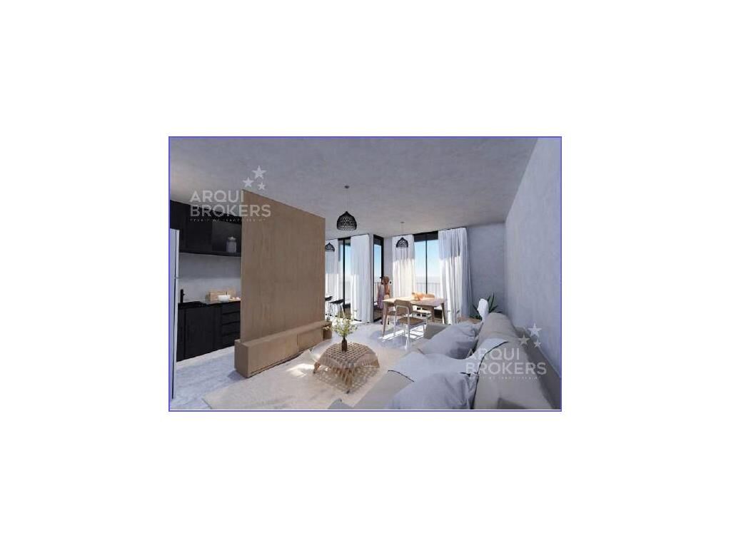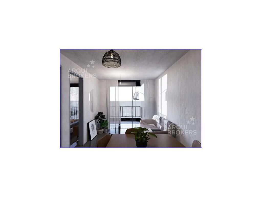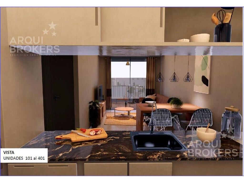 Living comedor con terraza al frente, cocina integrada con placares, 2 dormitorios con terraza, 1 baño.