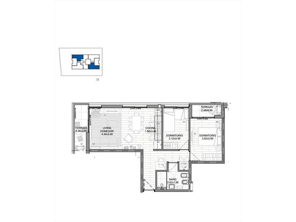 Living comedor con terraza, cocina integrada con placares, 2 dormitorios, 1 con terraza y 1 baño.