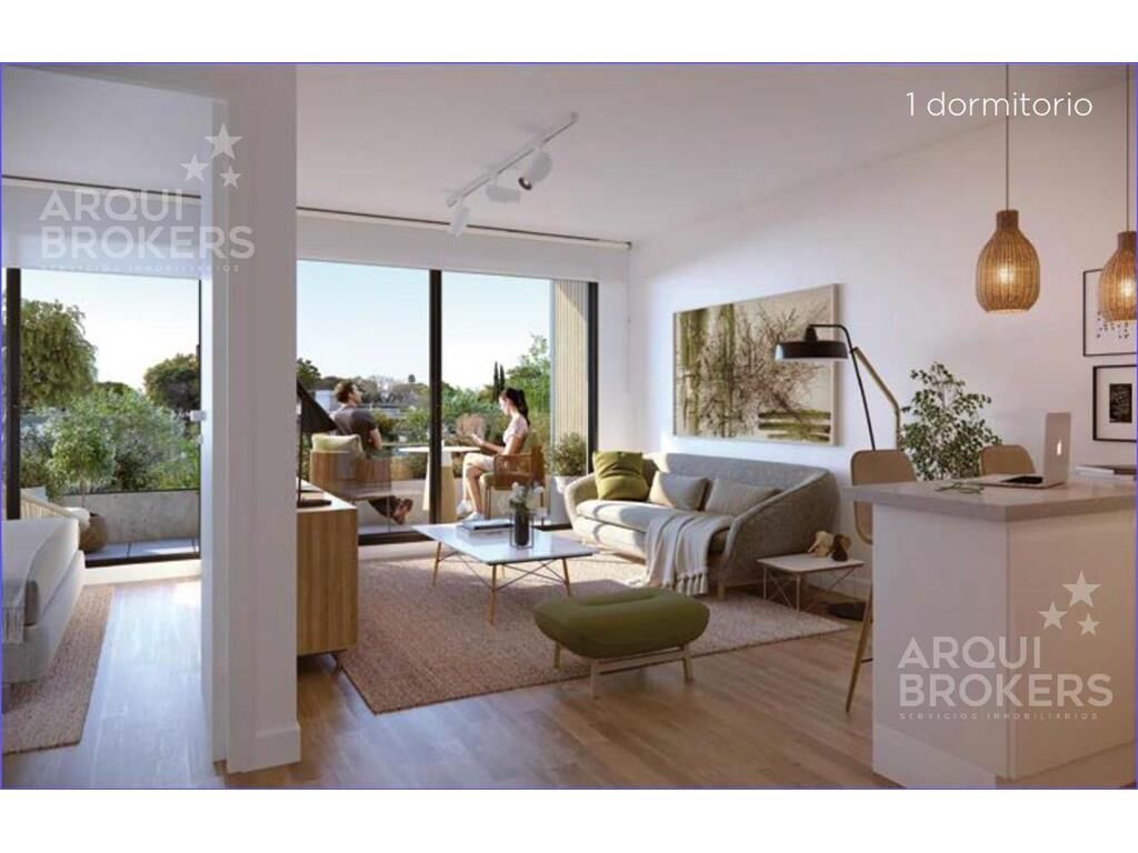 Living comedor con terraza al jardín, cocina integrada con placares, 2 dormitorios, 1 baño.