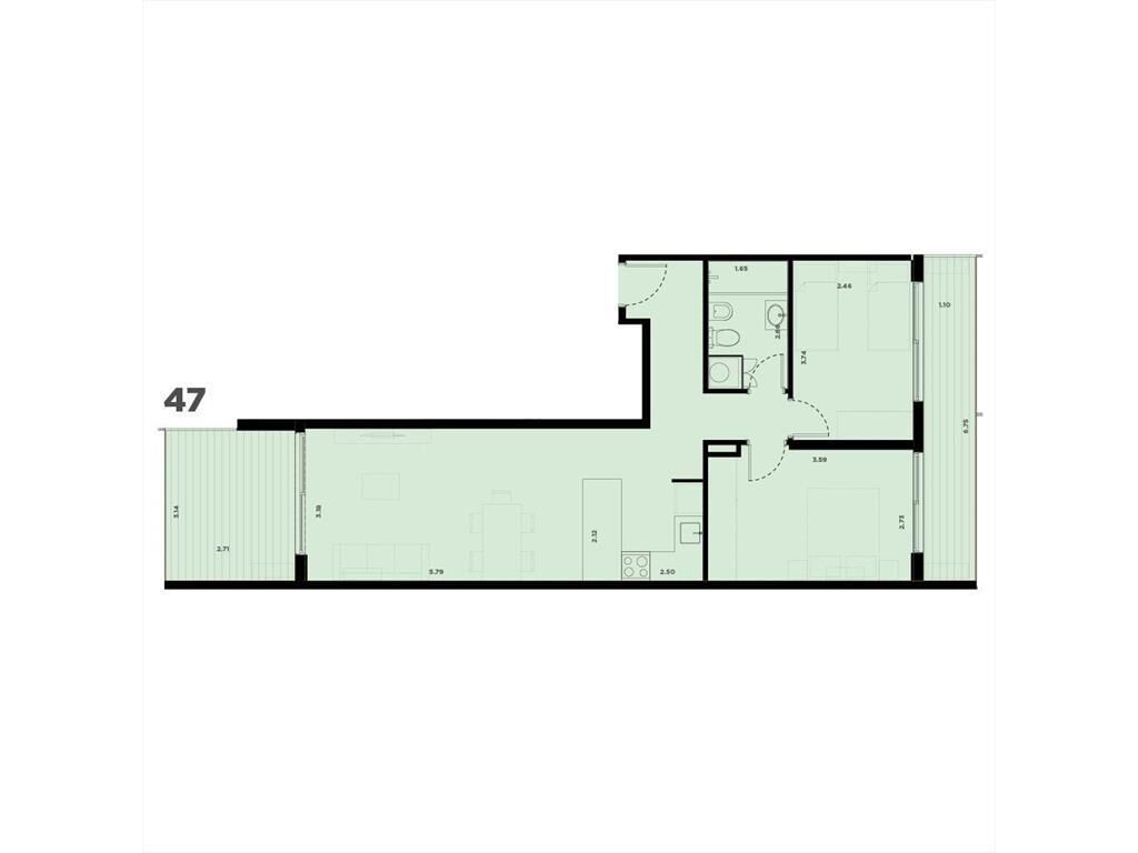 Living comedor con terraza al jardín, cocina integrada con placares, 2 dormitorios con terraza, 1 baño.