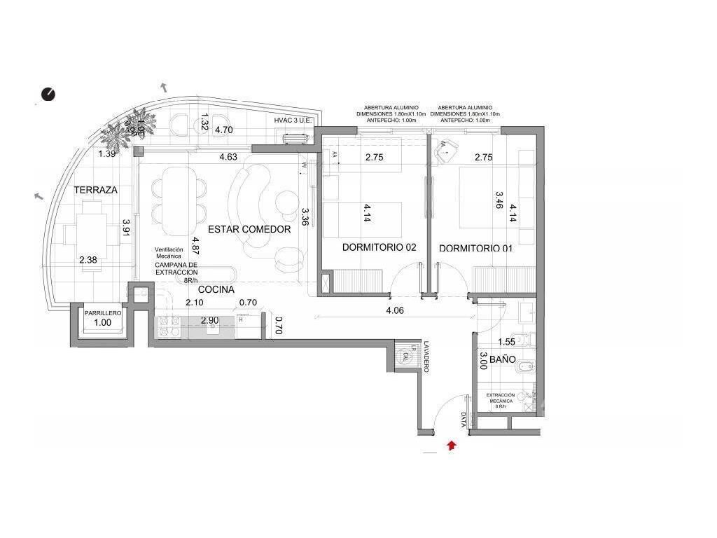 Living comedor con terraza en "L" con parrillero, cocina integrada con placares, 2 dormitorios al frente con placard y salida a terraza, 1 baño.