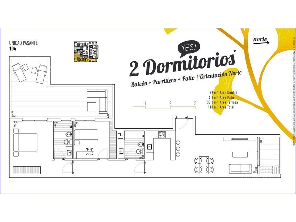 Living comedor con terraza al frente con parrillero, cocina integrada con placares, 2 dormitorios con placares, 1 en suite, 2 baños completos. Patio de 28m2.