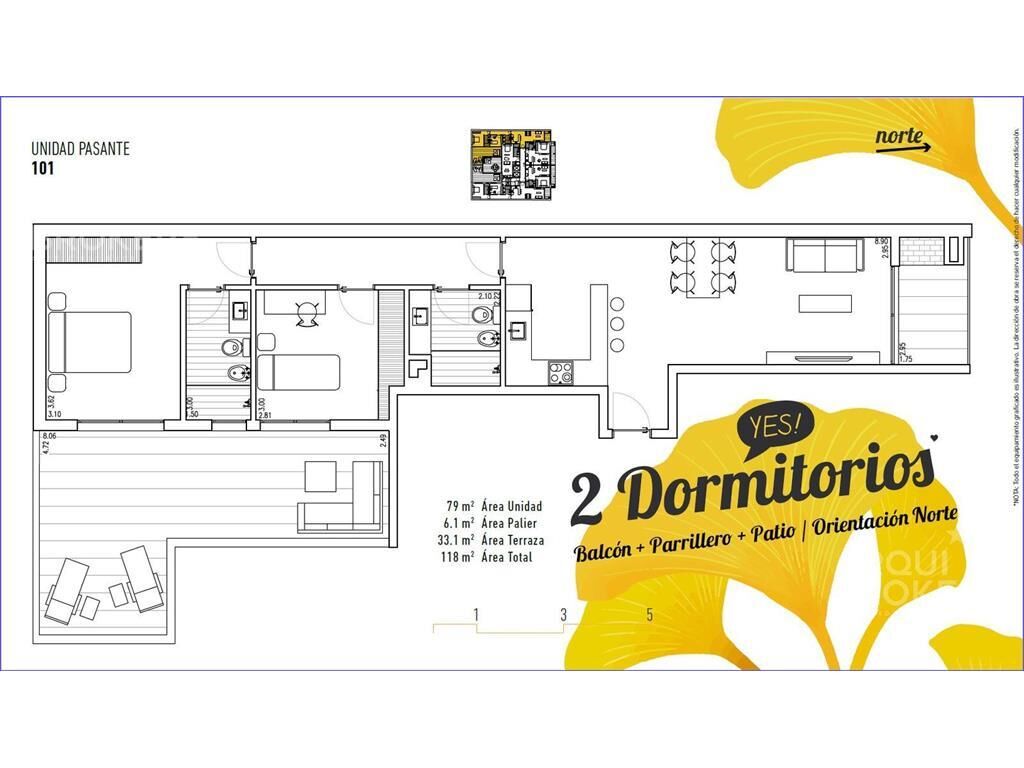 Living comedor con terraza al frente con parrillero, cocina integrada con placares, 2 dormitorios con placares, 1 en suite, 2 baños completos. Patio de 28m2.
