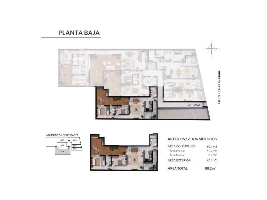 Living comedor con salida a patio de 28m2 con parrillero, cocina integrada con placares y barra, 2 dormitorios con placares, el principal al frente en suite, 2 baños completos.