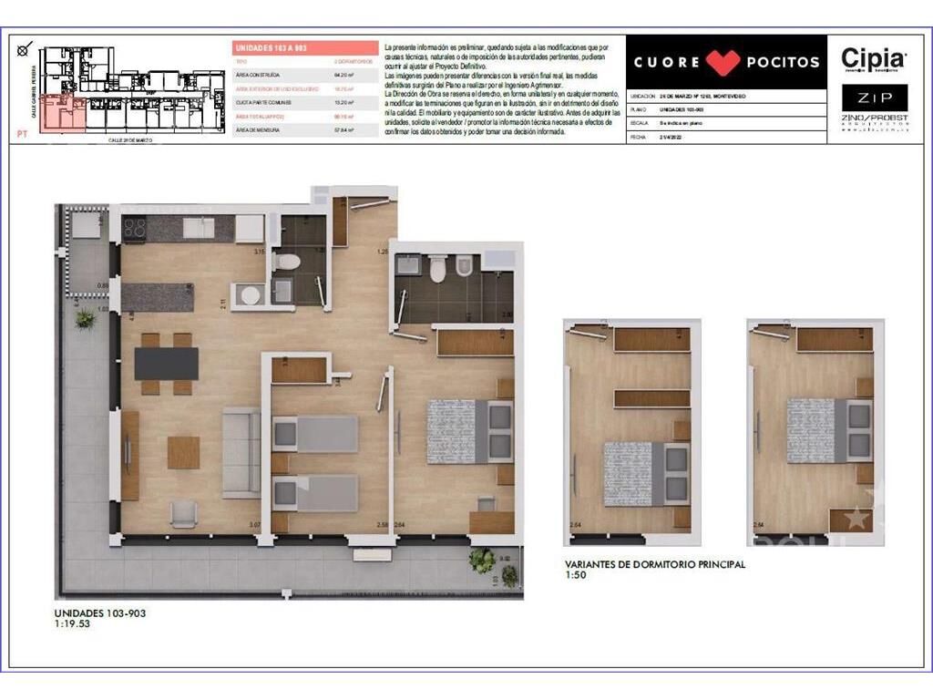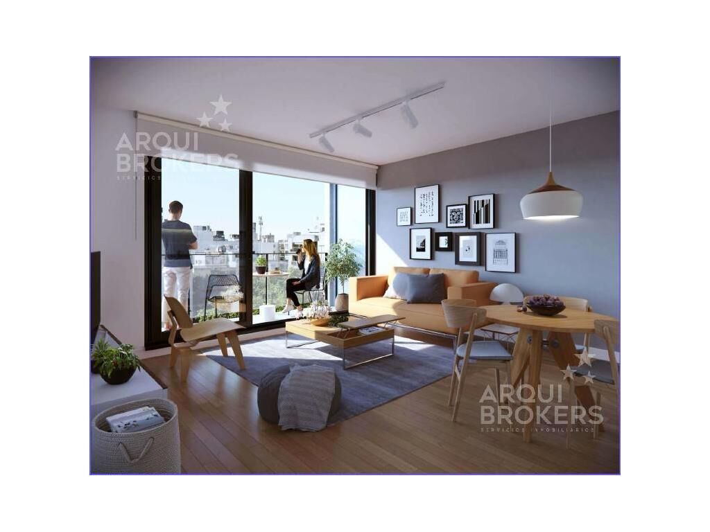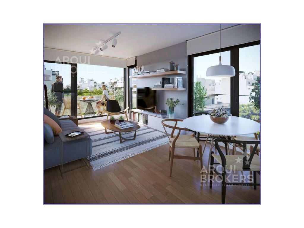 Living comedor con terraza al frente, cocina integrada con placares, 2 dormitorios con placares, 1 en suite, 2 baños.
