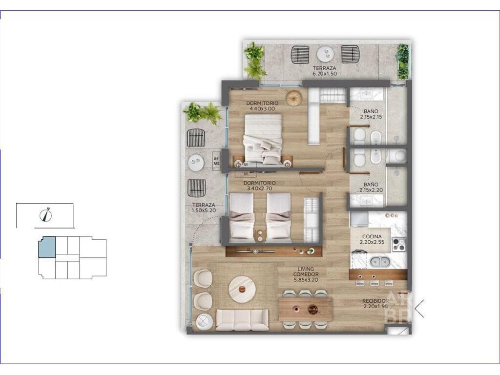 Living comedor con terraza, cocina integrada con placares y campana, horno y anafe, 2 dormitorios con placares y terraza, 1 en suite con vestidor y salida a terraza, 2 baños completos.
