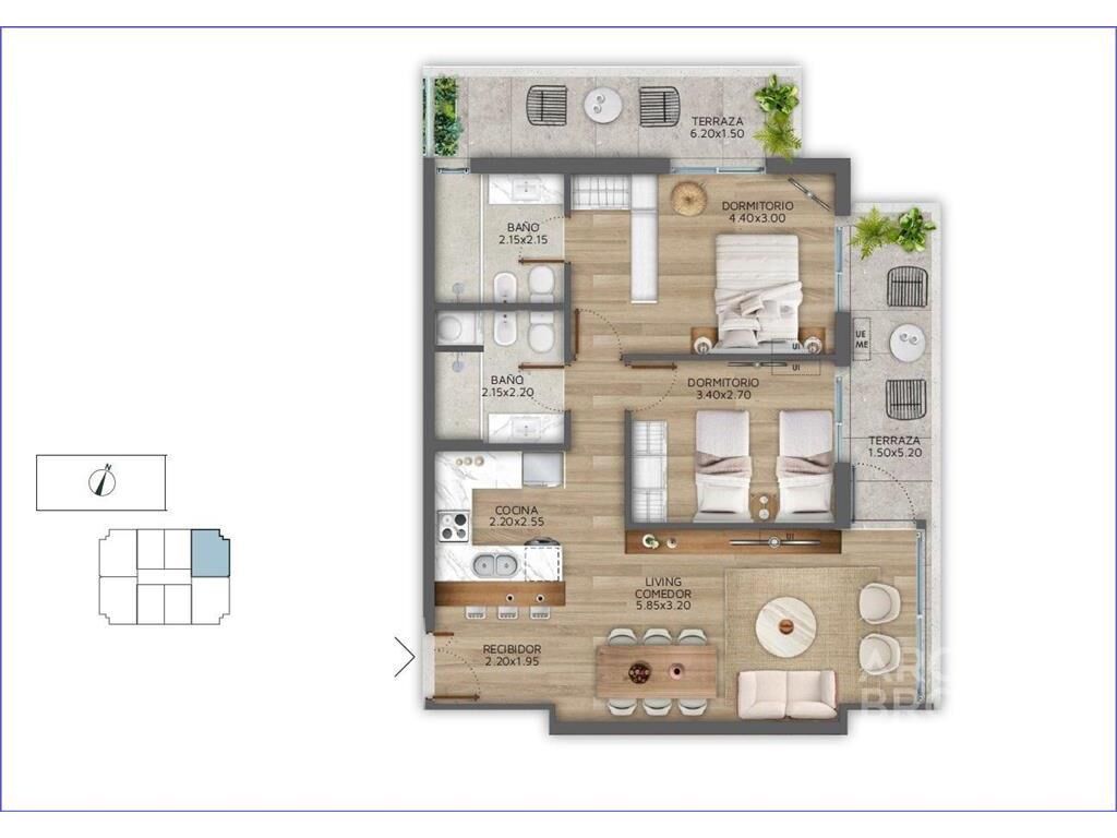 Living comedor con terraza, cocina integrada con placares y campana, horno y anafe, 2 dormitorios con placares y terraza, 1 en suite con vestidor y salida a terraza, 2 baños completos.