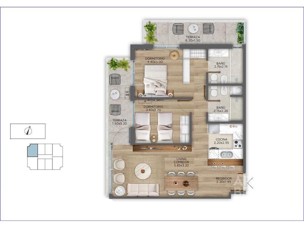 Living comedor con terraza, cocina integrada con placares y campana, horno y anafe, 2 dormitorios con placares y terraza, 1 en suite con vestidor y salida a terraza, 2 baños completos.