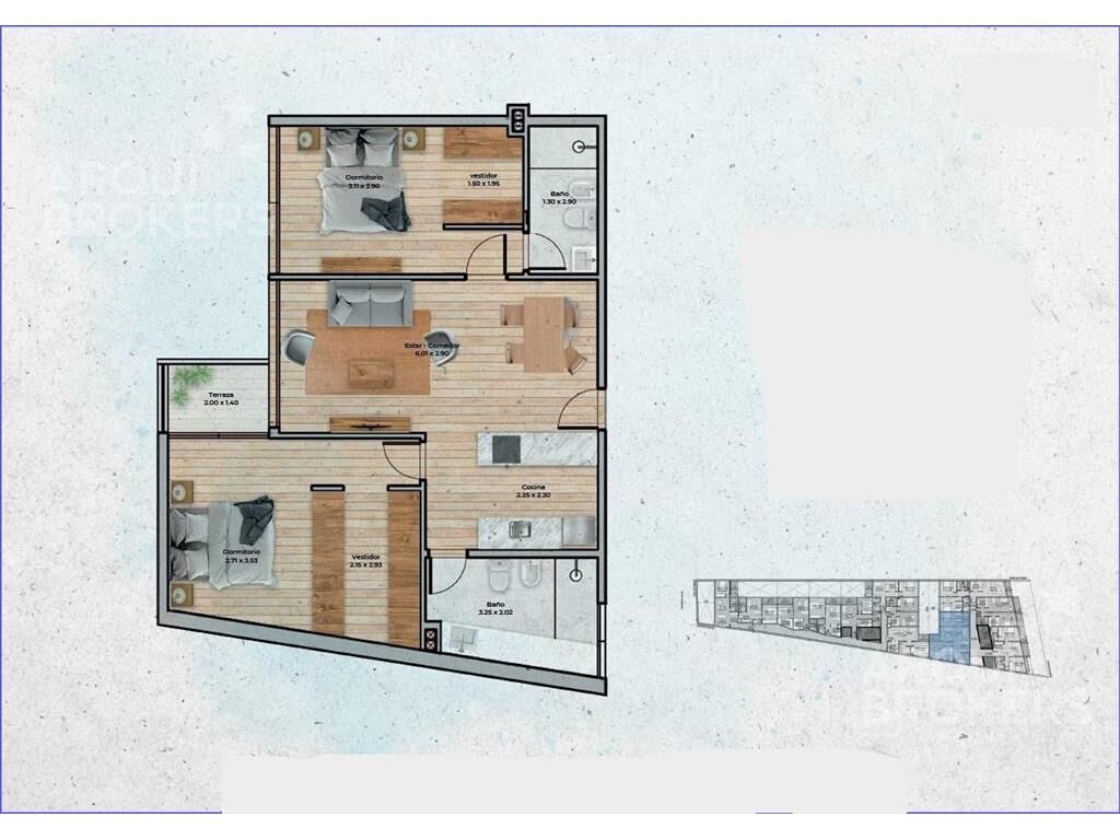 Living comedor con terraza, cocina integrada con placares, 2 dormitorios con vestidor, el principal en suite, 2 baños completos.