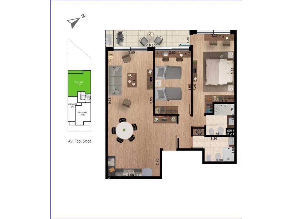 Living comedor con terraza, cocina integrada con placares, lavadero, 2 dormitorios, 1 en suite, 2 baños completos.