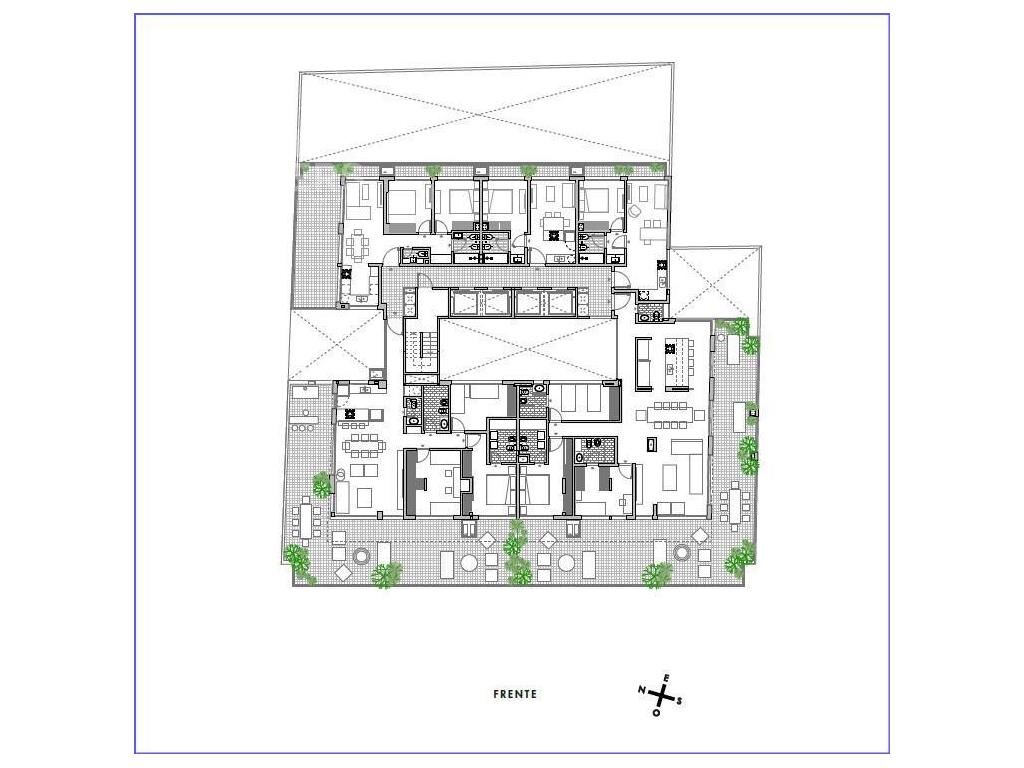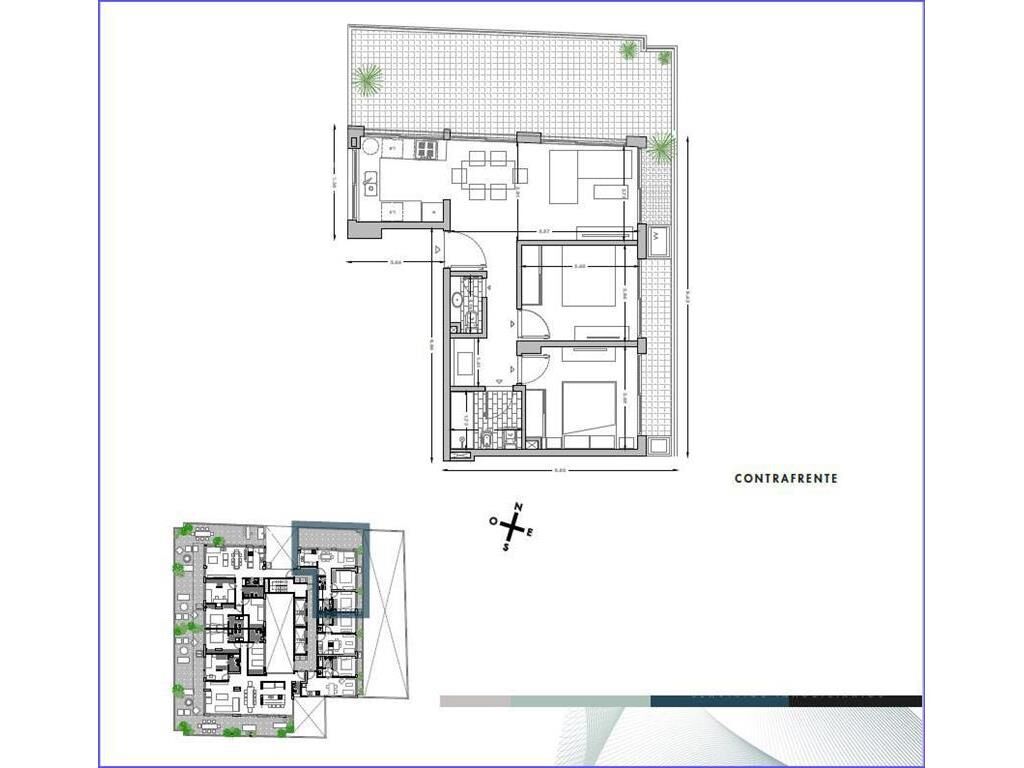 Living comedor con terraza de 38 m2 en "L", cocina integrada con placares, con bacha de acero inoxidable y mesadas de Silestone, horno anafe y campana de extracción. 2 dormitorios con placares, 1 baño completo y 1 baño social.