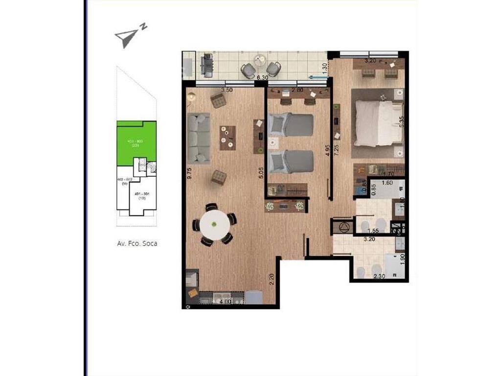 Living comedor con terraza, cocina integrada con placares, lavadero, 2 dormitorios, 1 en suite, 2 baños completos.