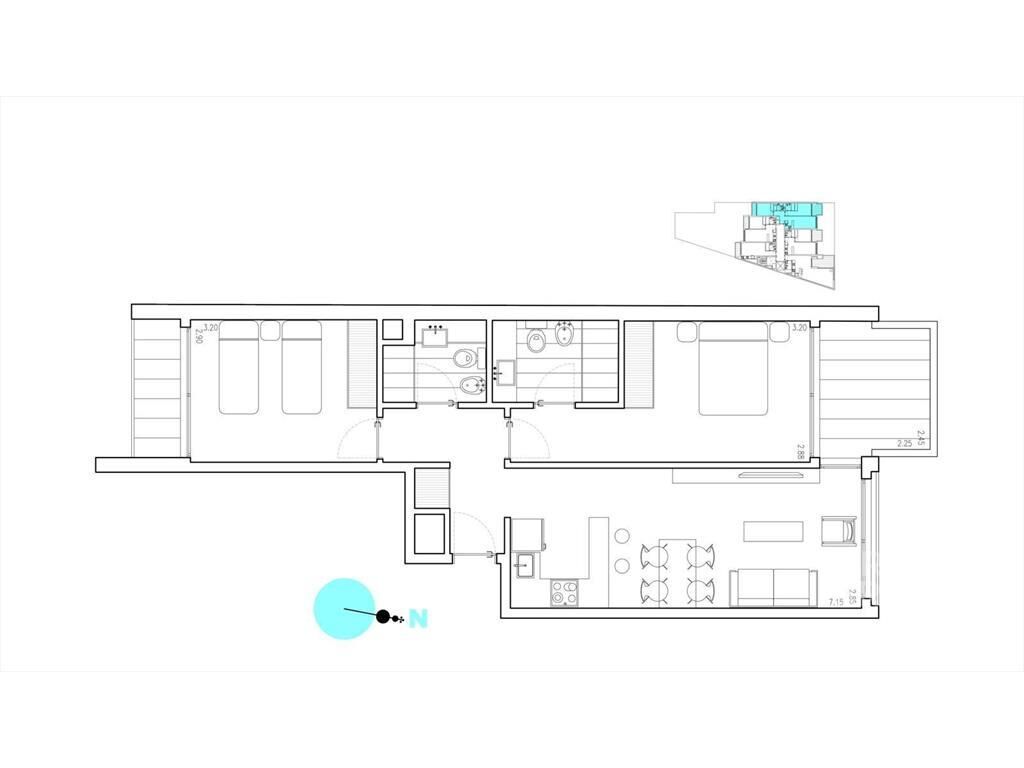 Living comedor con terraza al frente, cocina integrada con placares, 2 dormitorios con placares, 1 al frente en suite y 1 hacia atrás con terraza, 2 baños completos.