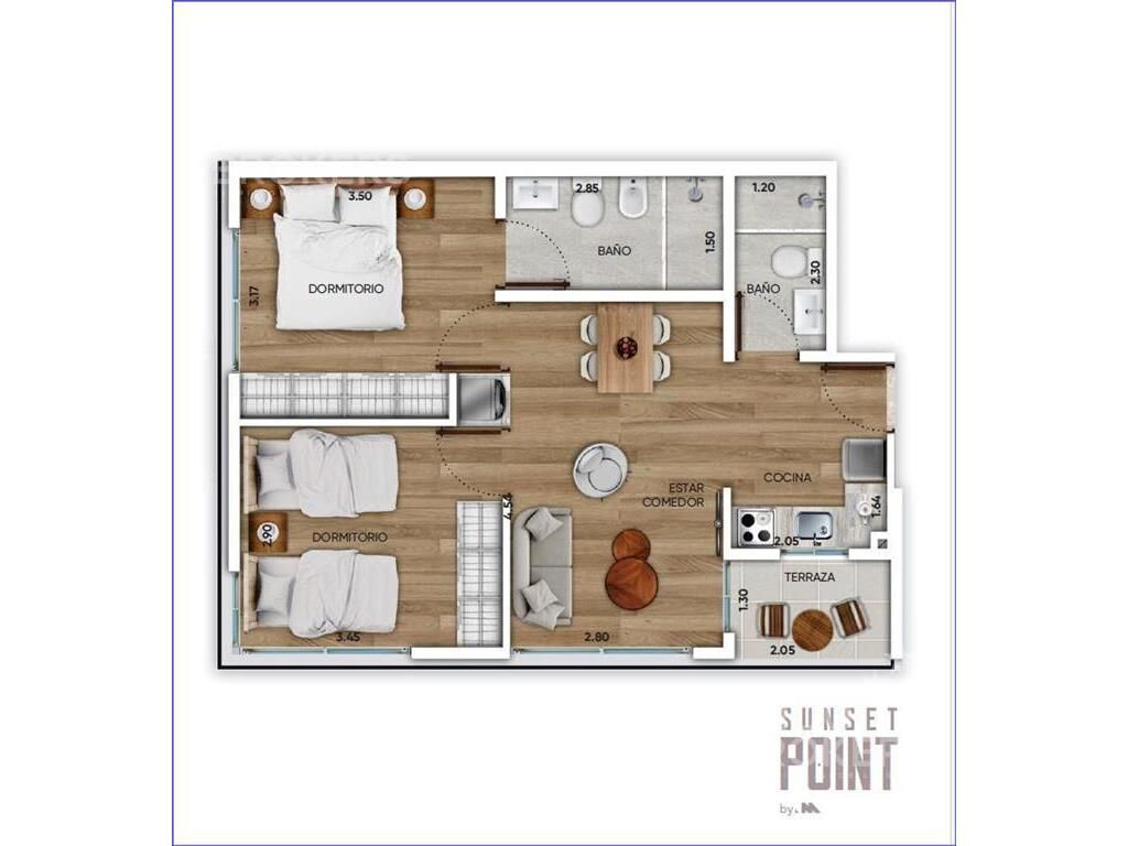 Living comedor con salida a terraza al frente, cocina integrada con placares, 2 dormitorios, 1 en suite y 2 baños completos.