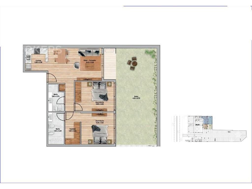 Living comedor con terraza y salida a patio de 42 m2, cocina integrada con placares, anafe, campana y termotanque, 2 dormitorios, el principal en suite con vestidor y otro con placard, 2 baños completos.