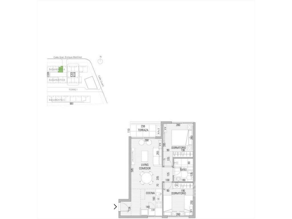 Living comedor con terraza, cocina integrada con placares bajo y sobre mesada, campana y previsión para conexión de lavarropas, 2 dormitorios, 1 baño.