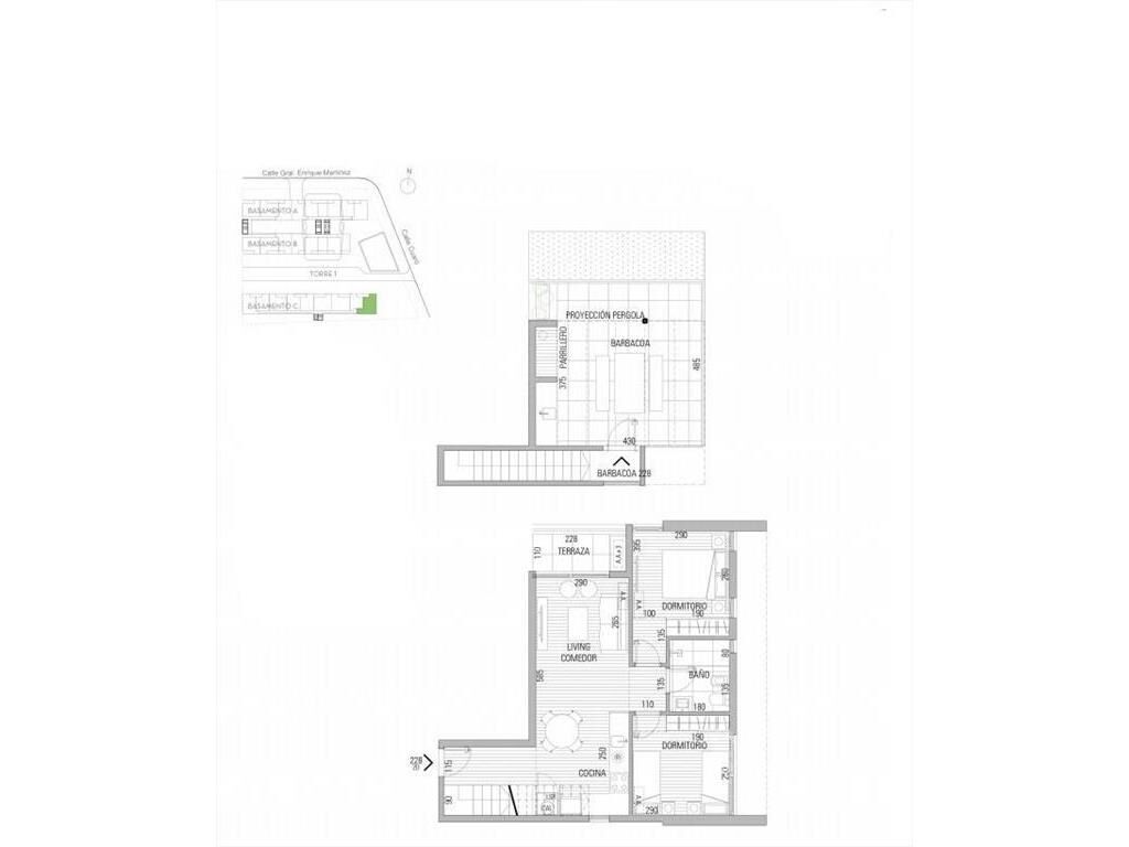 Living comedor con terraza, cocina integrada con placares bajo y sobre mesada, campana y previsión para conexión de lavarropas, 2 dormitorios, 1 baño. Azotea exclusiva de 26 m2 con parrillero y acceso desde dentro del apartamento.
