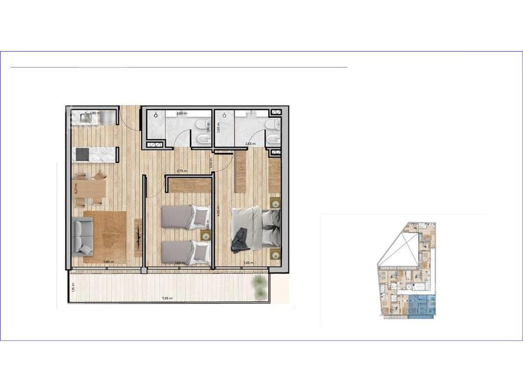 Living comedor con terraza, cocina integrada con placares sobre y bajo mesada, anafe, campana y termotanque, 2 dormitorios con placares, 1 en suite con vestidor,2 baños completos.