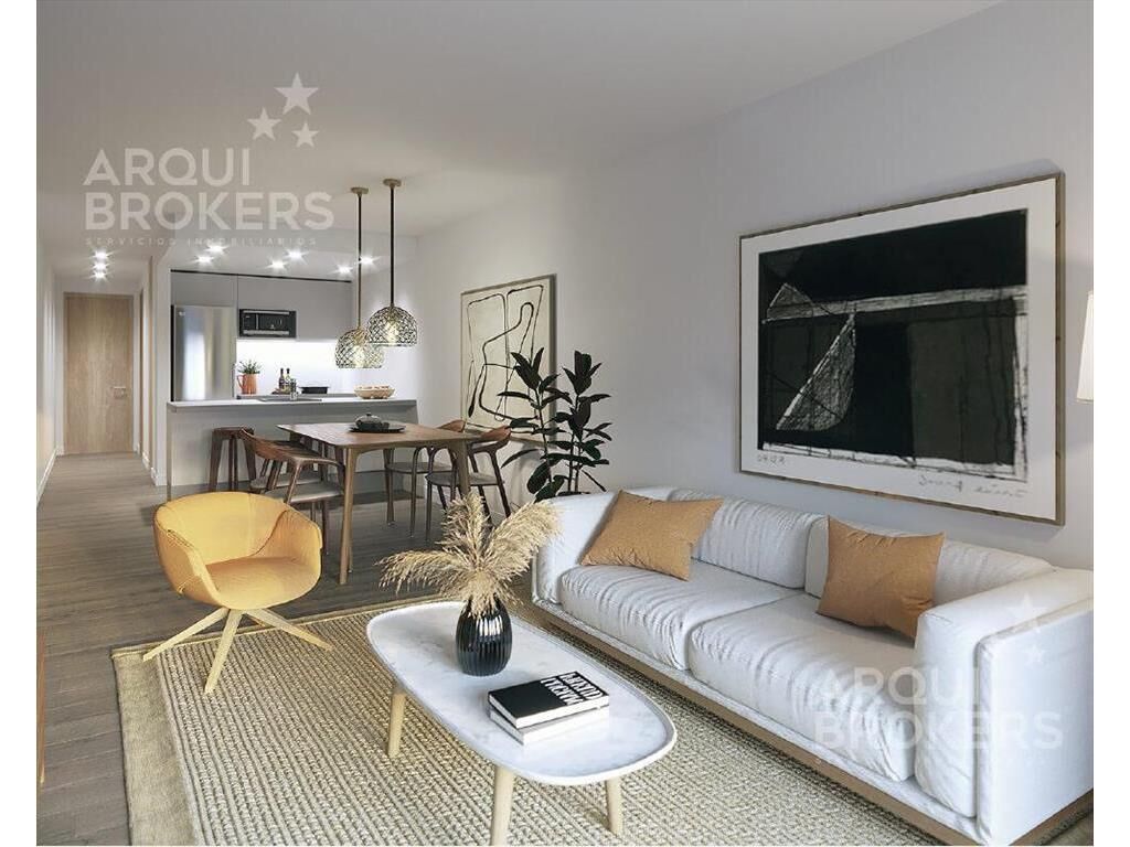 Living comedor con cocina semi integrada con barra y placares, 2 dormitorios con placares, 1 en suite, 2 baños completos.