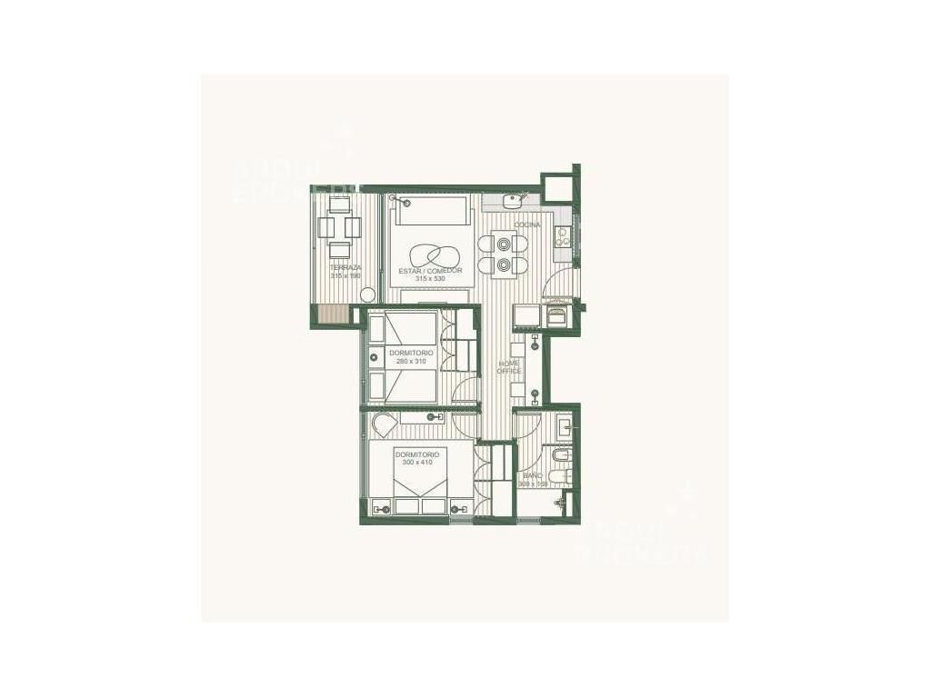 Living comedor con espacio para home office y terraza con parrillero, cocina integrada con placares, horno, anafe y extractor de aire. 2 dormitorios con placares, 1 baño completo con extractor de aire.