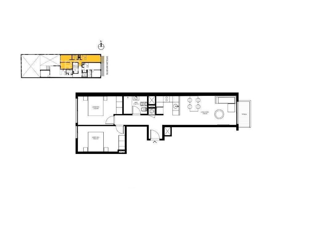 Living comedor al frente con terraza, cocina integrada con placares, 2 dormitorios, 1 baño completo.