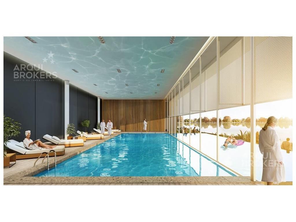 El edificio cuenta con con barbacoas con living, cowork, gimnasio, playroom, piscina interioy y exterior climatizada, solárium, losa radiante, seguridad, laundry, estación eléctrica, bicicletero, muelle privado y kayaks.