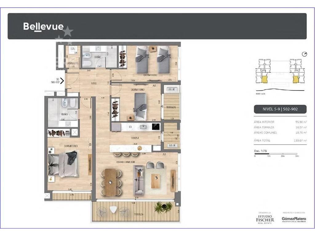 Living comedor con terraza, despojador, cocina semi integrada con barra y placares, 3 dormitorios, 1 en suite, 2 con terraza, 2 baños completos. Lavadero. Preinstalación para aire acondicionado.