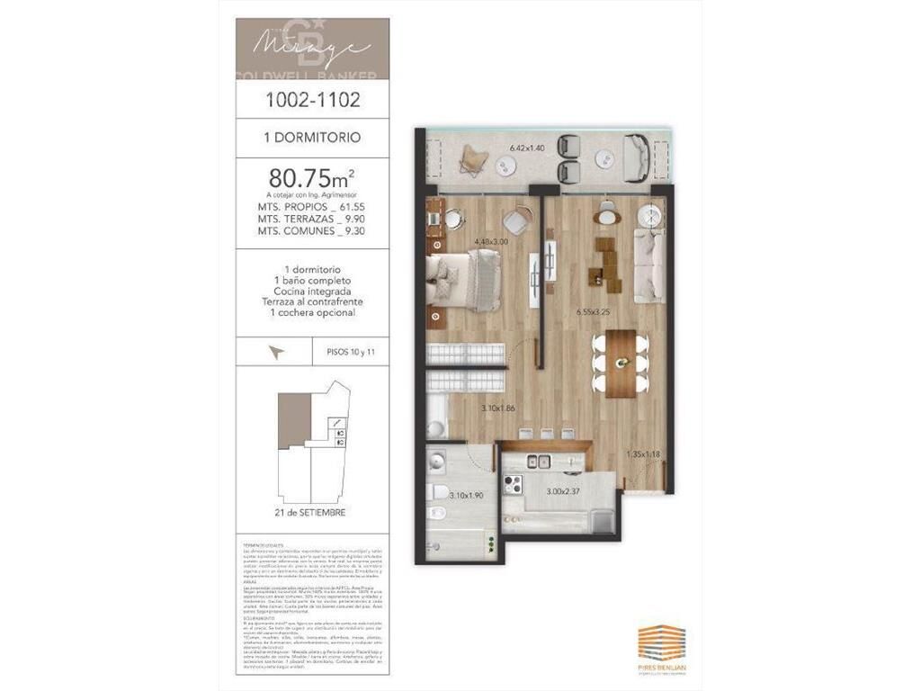 Se alquila totalmente equipado. Piso 11 al contrafrente. Living comedor con terraza al contrafrente, cocina integrada con barra, 1 dormitorio con salida a la terraza y 1 baño completo. Preinstalación de aire acondicionado. Pisos de madera natural plastificados semi-mate. Pisos y revestimientos en porcelanato importado calidad premium. Calefacción por losa radiante individual. Garaje opcional U$S 120, no incluido en el precio. El edificio cuenta con 2 ascensores de última generación con capacidad para 8 personas. Hall de acceso, palliers y barbacoa totalmente equipada. U1102 Ref. AC Referencia: ABU35017 AP3542020 Honorarios por intermediación: 3% + IVA para operaciones de compra. Un mes de alquiler + IVA para operaciones de alquiler. La información contenida en el presente documento ha sido proporcionada íntegramente por el/los propietarios del inmueble. Arquibrokers Servicios Inmobiliarios no se responsabiliza por las diferencias ni las modificaciones que puedan surgir a partir de este documento.
