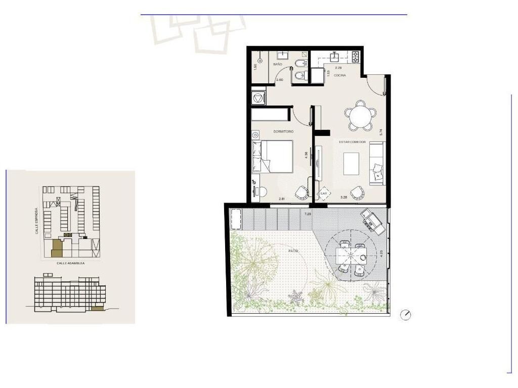 Living comedor con toldo vertical, cocina integrada con muebles sobre y bajo mesada, campana extractora de acero inoxidable y anafe eléctrico, previsión espacio para horno eléctrico, heladera y microondas. Placard para lavarropas. 1 dormitorio con placares, 1 baño completo. Patio de 35 m2. Estufa de alto rendimiento.