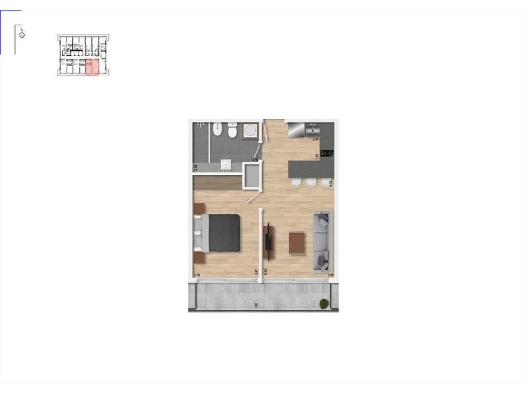 Living comedor con terraza al frente, cocina integrada con placares, 1 dormitorio al frente, 1 baño.