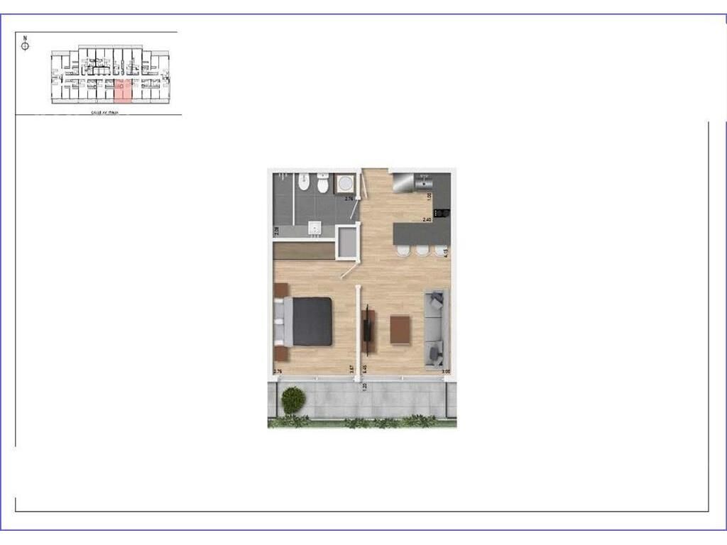 Living comedor con terraza al frente, cocina integrada con placares, 1 dormitorio al frente, 1 baño.