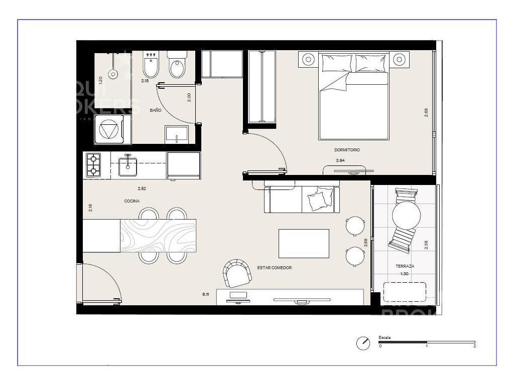 Living comedor con terraza y toldo vertical, cocina integrada con muebles sobre y bajo mesada, campana extractora de acero inoxidable y anafe eléctrico, previsión espacio para horno eléctrico, heladera y microondas. Placard para lavarropas. 1 dormitorio con placard, 1 baño completo.