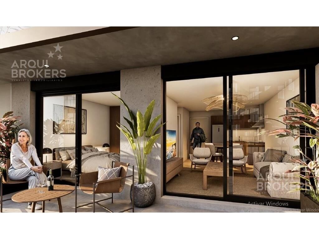 Living comedor con terraza, cocina integrada con placares, 1 dormitorio, 1 baño.