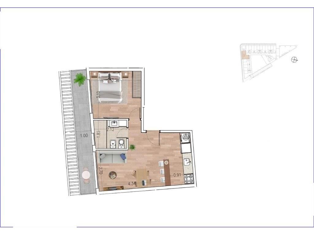 Living comedor con amplia terraza, cocina integrada con barra, 1 dormitorio, 1 baño completo.