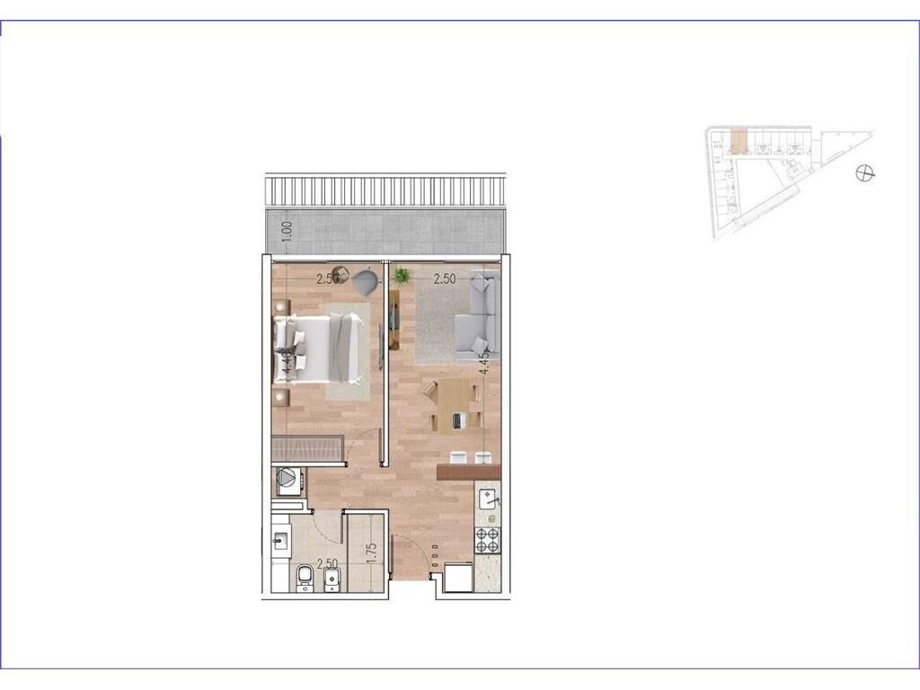 Living comedor con terraza, cocina integrada con barra, 1 dormitorio, 1 baño completo.