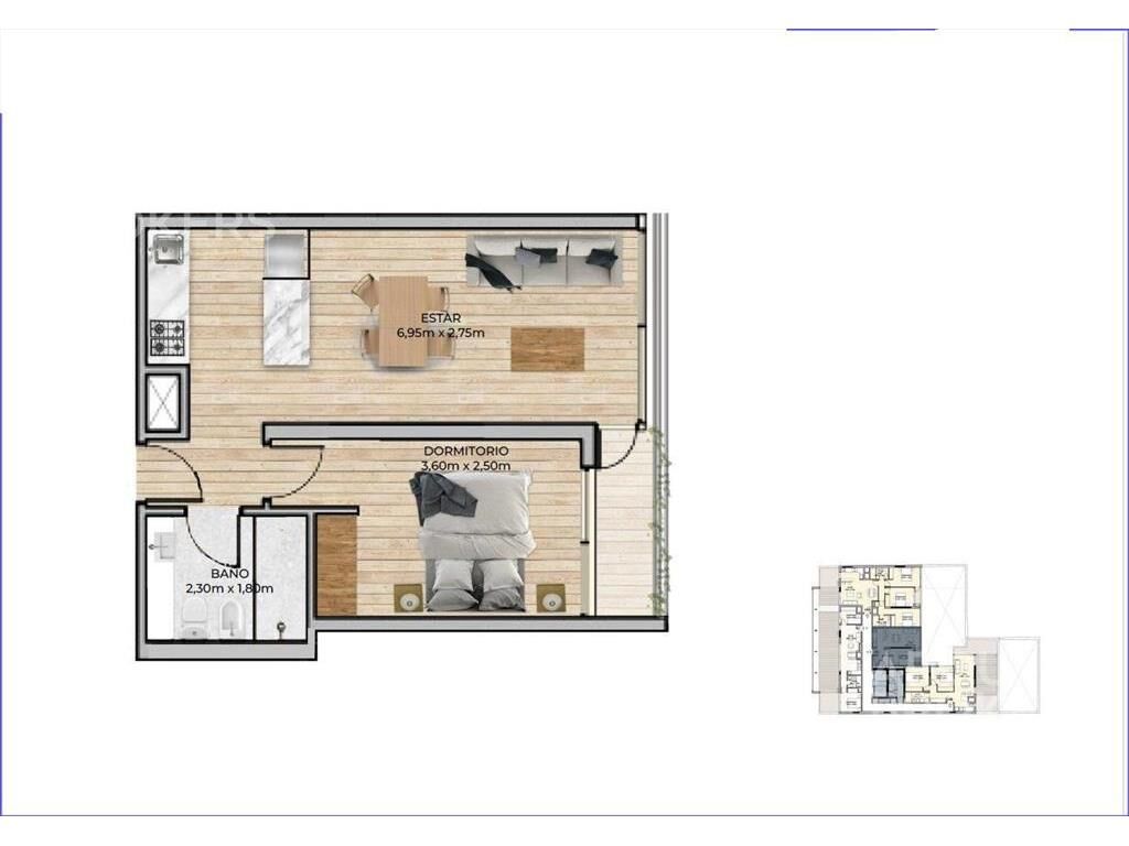 Living comedor con terraza, cocina integrada con placares, anafe y termotanque, 1 dormitorio con placard, 1 baño completo.