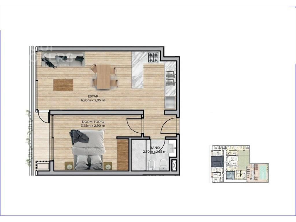 Living comedor con terraza, cocina integrada con placares, anafe y termotanque, 1 dormitorio con placard, 1 baño completo.