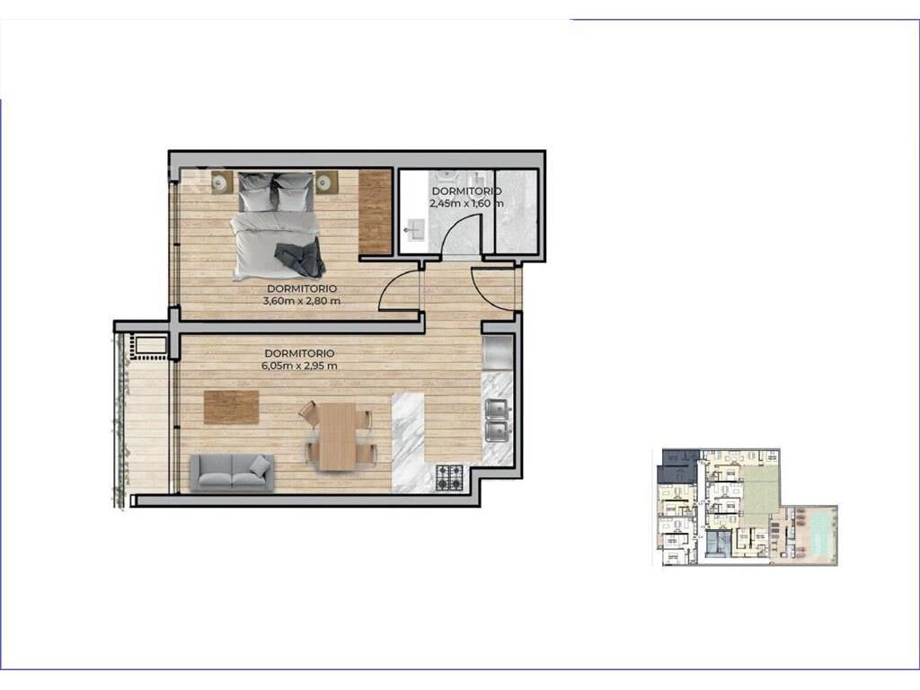 Living comedor con terraza, cocina integrada con placares, anafe y termotanque, 1 dormitorio con placard, 1 baño completo.