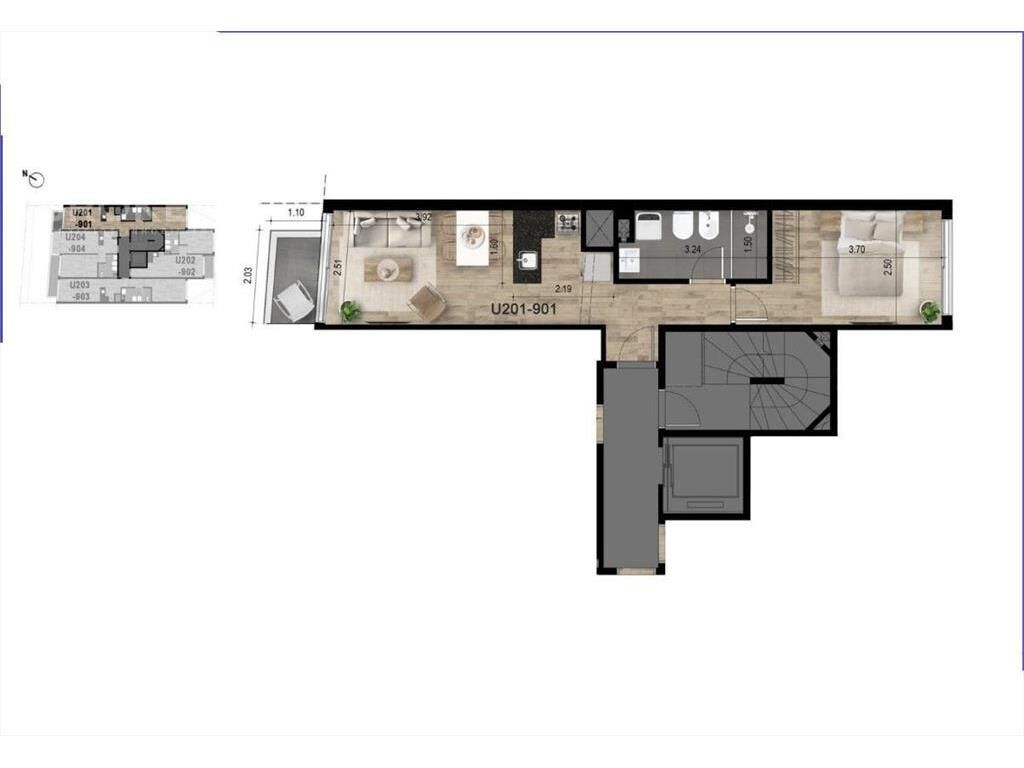 Living comedor con terraza, cocina integrada con placares, 1 dormitorio, 1 baño.