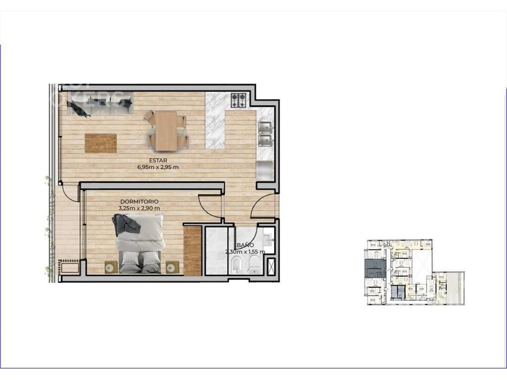 Living comedor con terraza, cocina integrada con placares, anafe y termotanque, 1 dormitorio con placard, 1 baño completo.